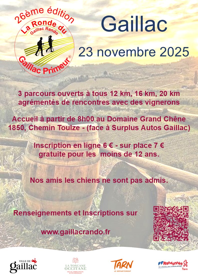 GaillacLa 26ᵉ édition de la Ronde du Gaillac Primeur® aura lieu le 23 novembre 2025. Trois parcours ouverts à tous sont proposés : 12 km, 16 km et 20 km, agrémentés de rencontres avec des vignerons. Inscriptions : En ligne : 6 € Sur place : 7 € Informations et inscriptions : https://www.rando-tarn.com/2025/04/28/dimanche-23-novembre-2025-26%C3%A8me-ronde-du-gaillac-primeur-gaillac/
