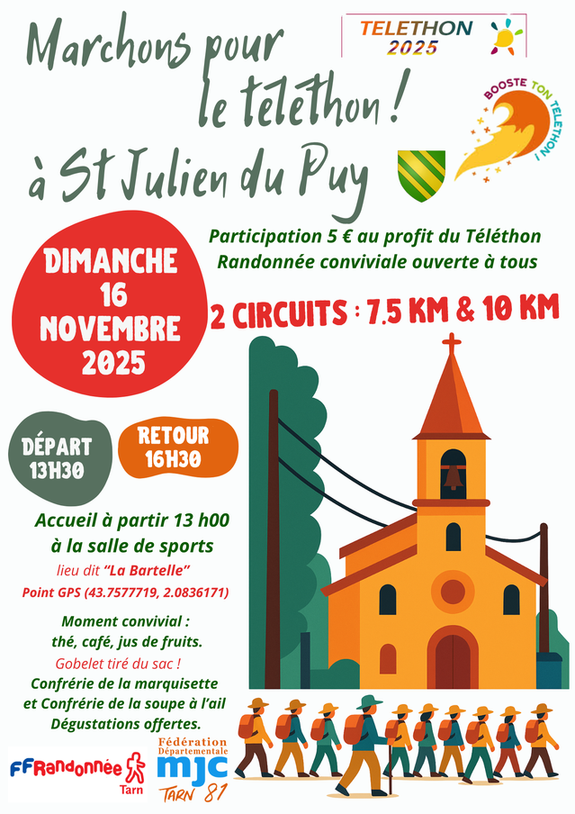 Saint-Julien-du-PuyLe dimanche 16 novembre 2025, la FFRandonnée Tarn et la MJC du Tarn organisent une marche pour le Téléthon à Saint-Julien-du-Puy (81). Participation : 5 € au profit du Téléthon. Plus d’informations : https://www.rando-tarn.com/2025/10/02/dimanche-16-novembre-2025-marchons-pour-le-t%C3%A9l%C3%A9thon-saint-julien-du-puy/