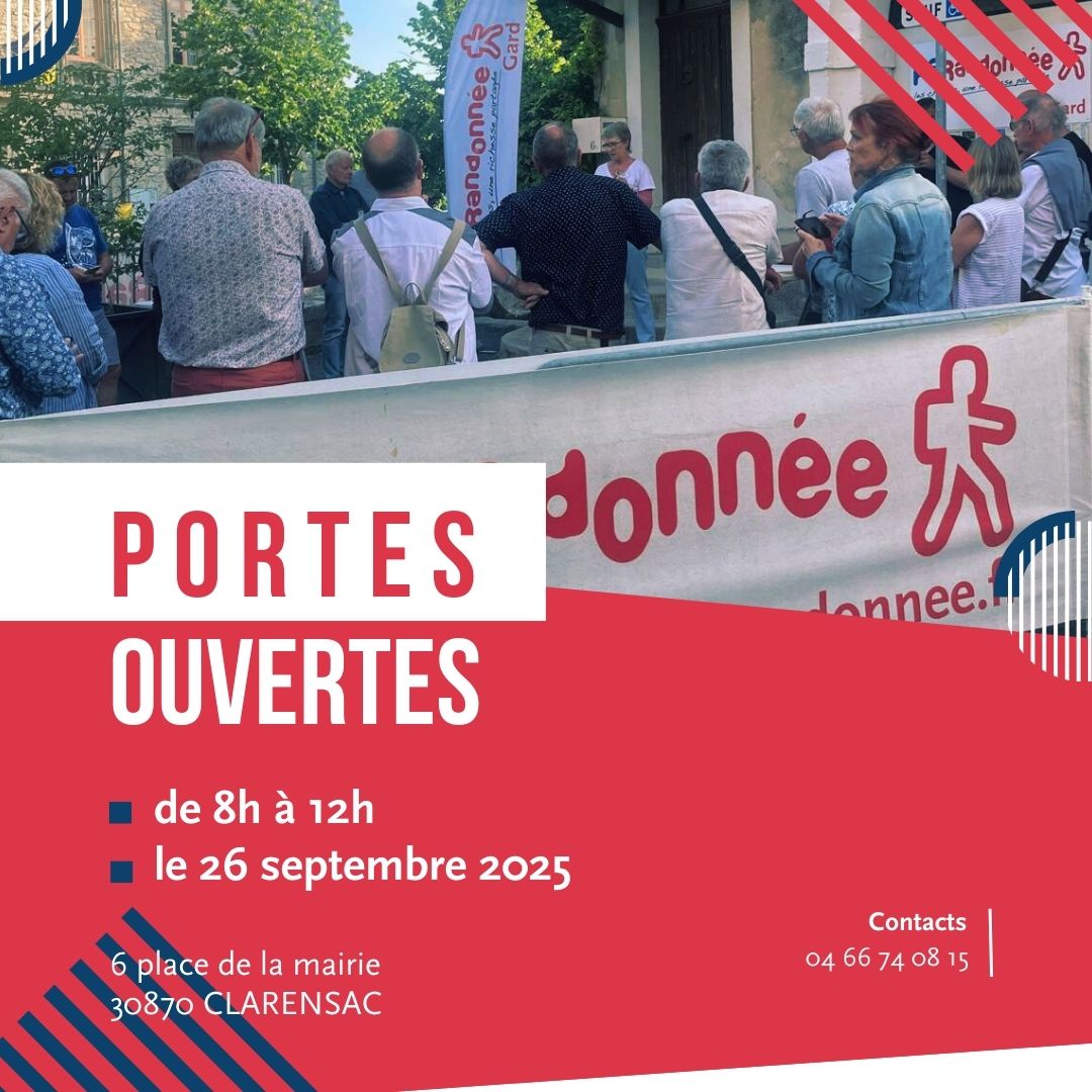 Matinée portes ouvertes à la FFRandonnée Gard 2025, c’est le vendredi 26 septembre à Clarensac de 8h à 12h ! La FFRandonnée Gard vous ouvre ses portes le vendredi 26 septembre 2025, de 8h à 12h, dans ses locaux au 6 place de la mairie à Clarensac. Une occasion idéale de venir nous rencontrer et de découvrir le rôle de la fédération au cœur de la vie locale. Pendant toute la matinée, nous vous proposons : des échanges autour de nos missions et de nos clubs affiliés, des infos pratiques sur notre agenda, notre newsletter et nos réseaux sociaux, une présentation du rôle essentiel des bénévoles, baliseurs et [...]