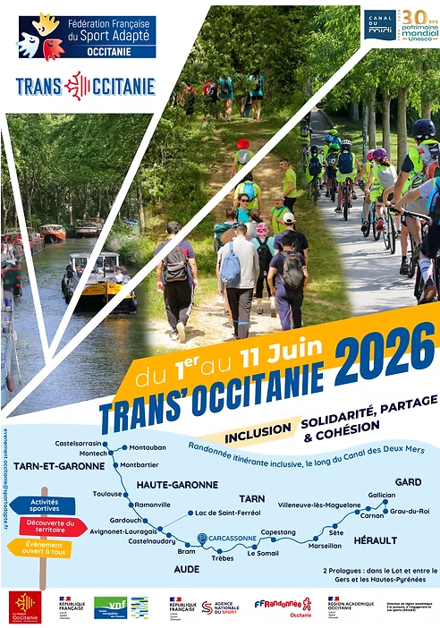 La Trans’Occitanie est une randonnée itinérante inclusive portée par la Ligue du Sport Adapté Occitanie, et mise en œuvre localement par les Comités Départementaux du Sport Adapté (CDSA). Destinée à des publics en situation de troubles du neurodéveloppement et/ou de troubles psychiques, elle suit le canal des Deux Mers, incluant notamment le canal latéral à la Garonne en Tarn-et-Garonne, pour (re)découvrir notre territoire occitan.