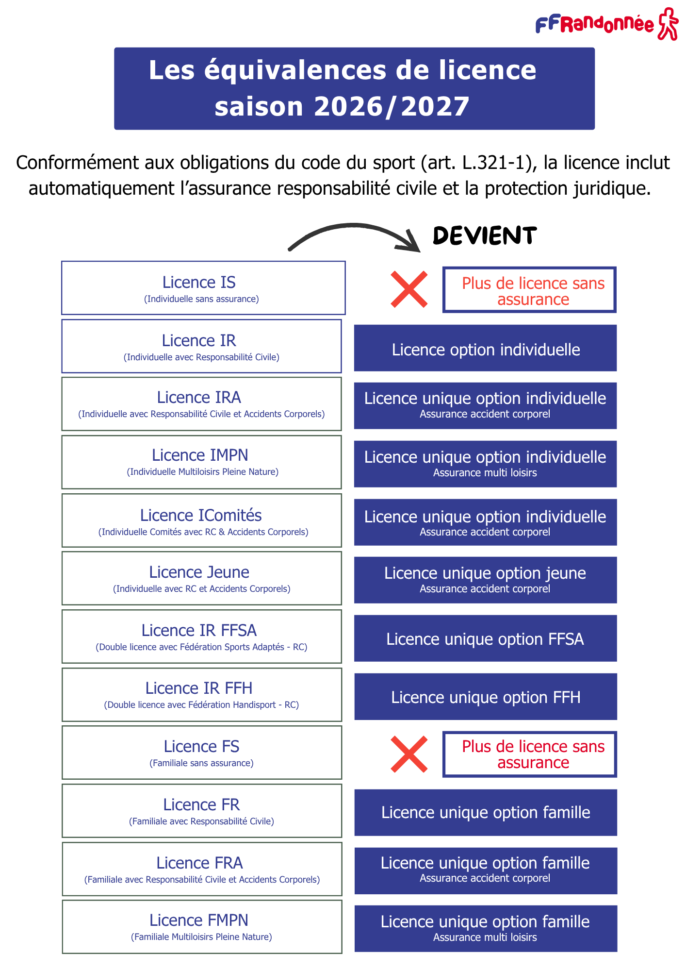 Il s’agira d’une seule licence modulable avec des options (individuelle, famille, jeune et double licence), prise par le club ou le comité et comprenant l’assurance responsabilité civile et la protection juridique. Les assurances complémentaires « accidents corporels » (ex-IRA) et « multi loisirs pleine nature » (ex-IMPN) continueront à être proposées. A ce titre, vous trouverez en pièce jointe un tableau récapitulatif des équivalences entre les anciennes licences et la nouvelle licence unique et ses options.